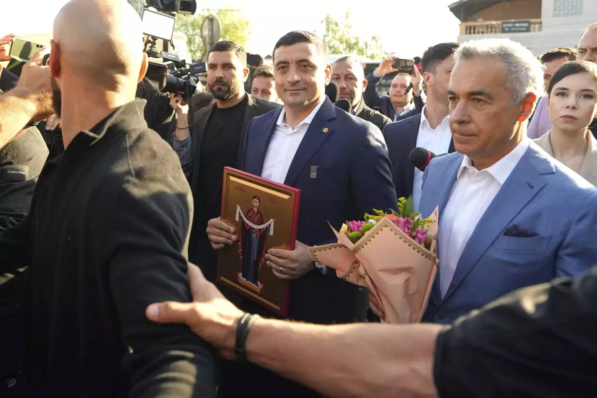Presidential candidate George Simion, left, holds a religious icon as he walks with Calin Georgescu, winner of the first round of last year's annulled election, after casting his vote in the first round of the presidential election redo in Mogosoaia, Romania, Sunday, May 4, 2025. (AP Photo/Vadim Ghirda)