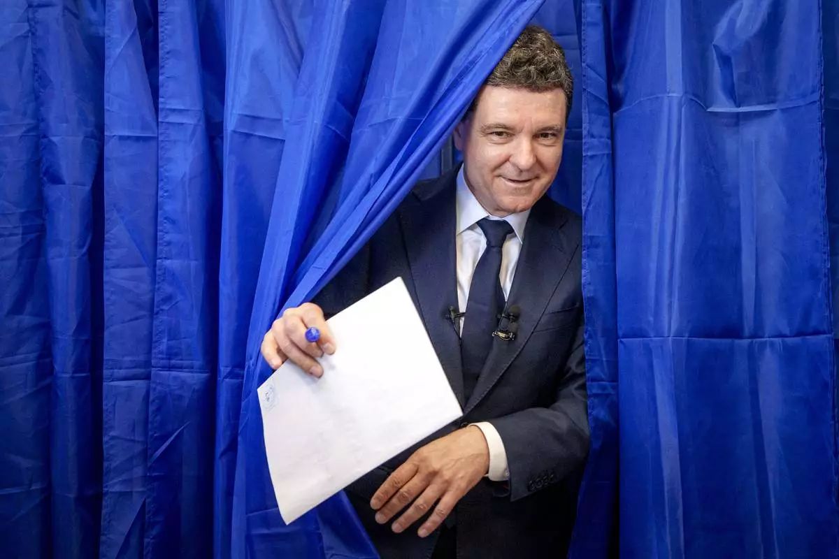 Presidential candidate Nicusor Dan exits a voting booth before casting his vote in the first round of the presidential election redo in Bucharest, Romania, Sunday, May 4, 2025. (AP Photo/Andreea Alexandru)