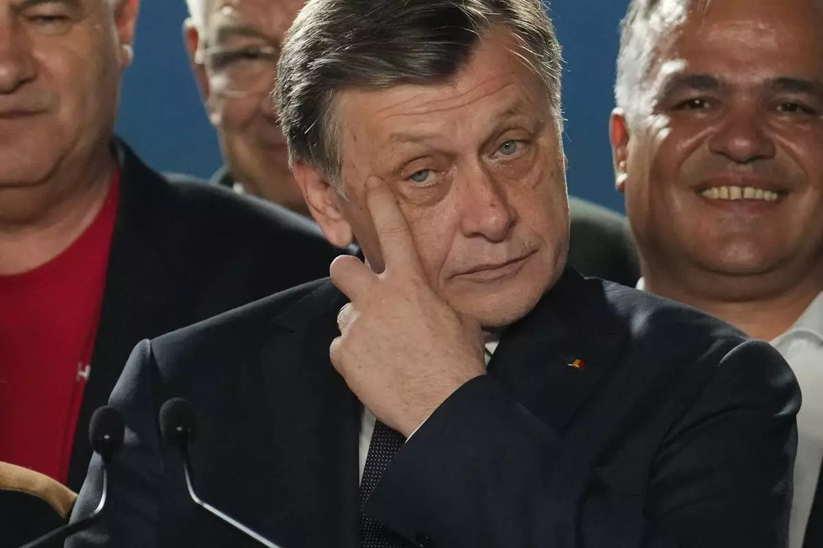 Presidential candidate Crin Antonescu attends a meeting with supporters after polls closed for the first round of the country's presidential election redo in Bucharest, Romania, Sunday, May 4, 2025. (AP Photo/Vadim Ghirda)