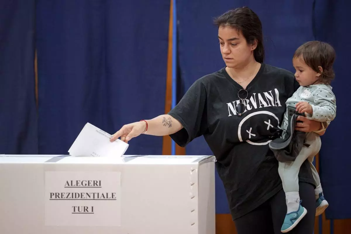 A woman holds a baby as she casts her vote in the first round of the presidential election redo in Bucharest, Romania, Sunday, May 4, 2025. (AP Photo/Andreea Alexandru)