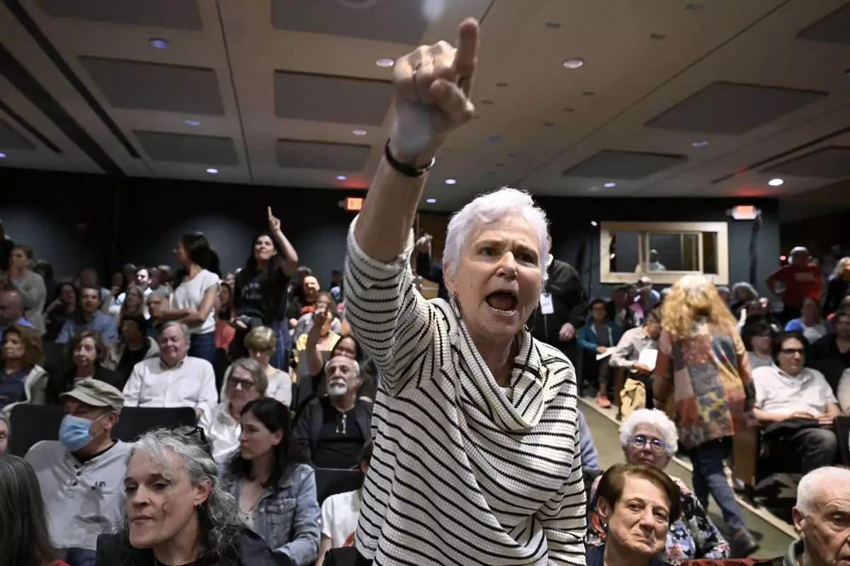 An audience member yells at U.S. Rep. Mike Lawler, R-N.Y., during a town hall, Sunday, May 4, 2025, in Somers, N.Y. (AP Photo/Jessica Hill)