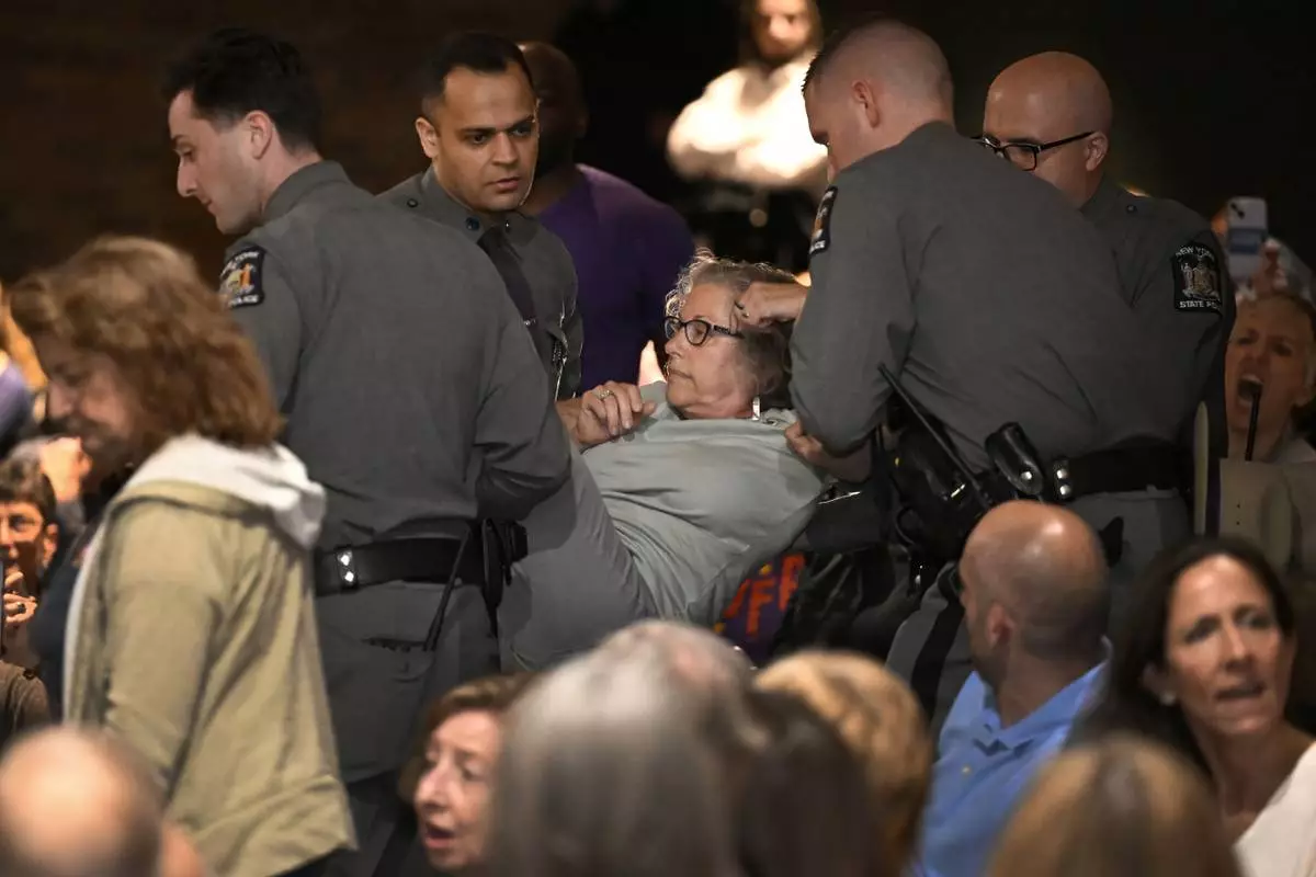 A woman is carried out by law enforcement at a town hall held by U.S. Rep. Mike Lawler, R-N.Y., Sunday, May 4, 2025, in Somers, N.Y. (AP Photo/Jessica Hill)