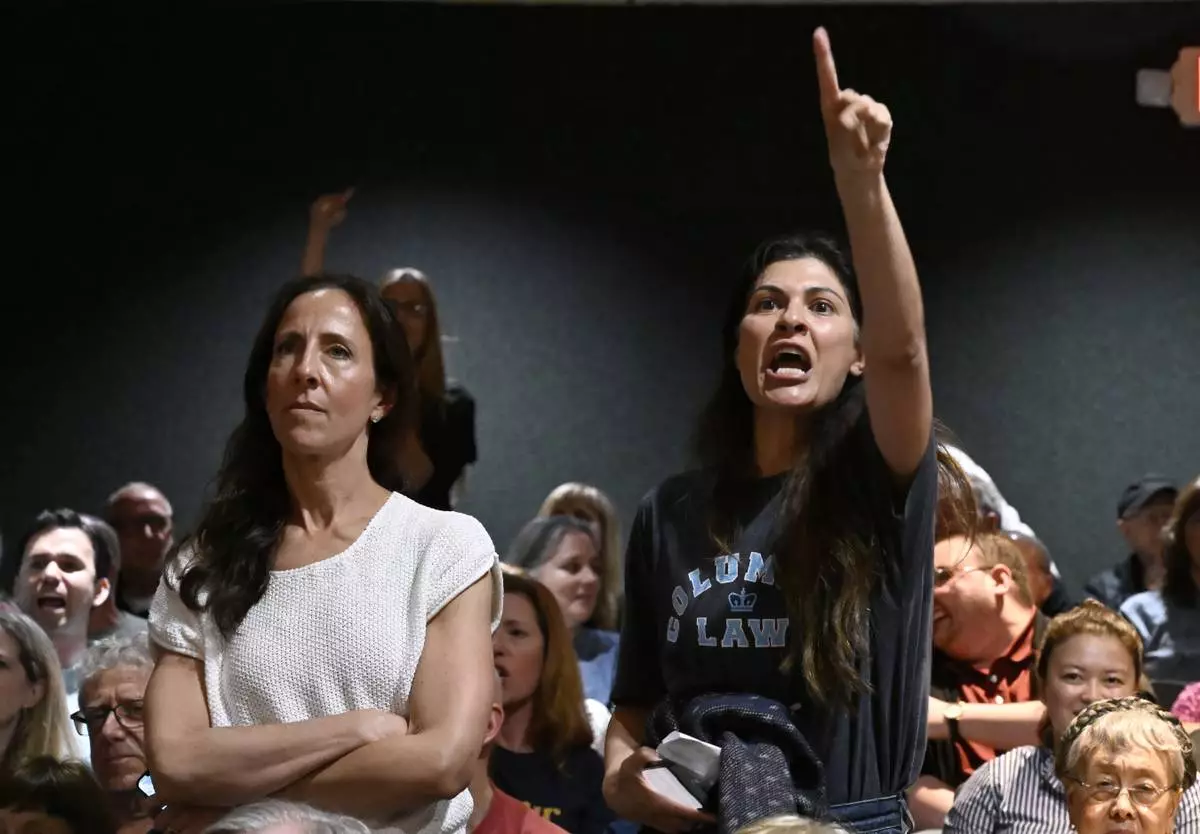 Audience members react to U.S. Rep. Mike Lawler, R-N.Y., speaking at a town hall, Sunday, May 4, 2025, in Somers, N.Y. (AP Photo/Jessica Hill)