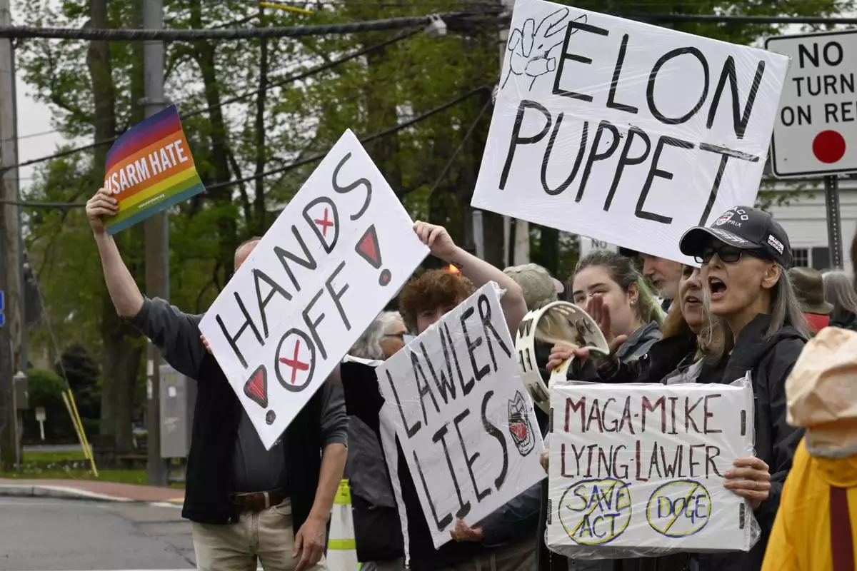 Protesters call out to vehicles driving through town before a town hall held by U.S. Rep. Mike Lawler, R-N.Y.Sunday, May 4, 2025, in Somers, N.Y. (AP Photo/Jessica Hill)