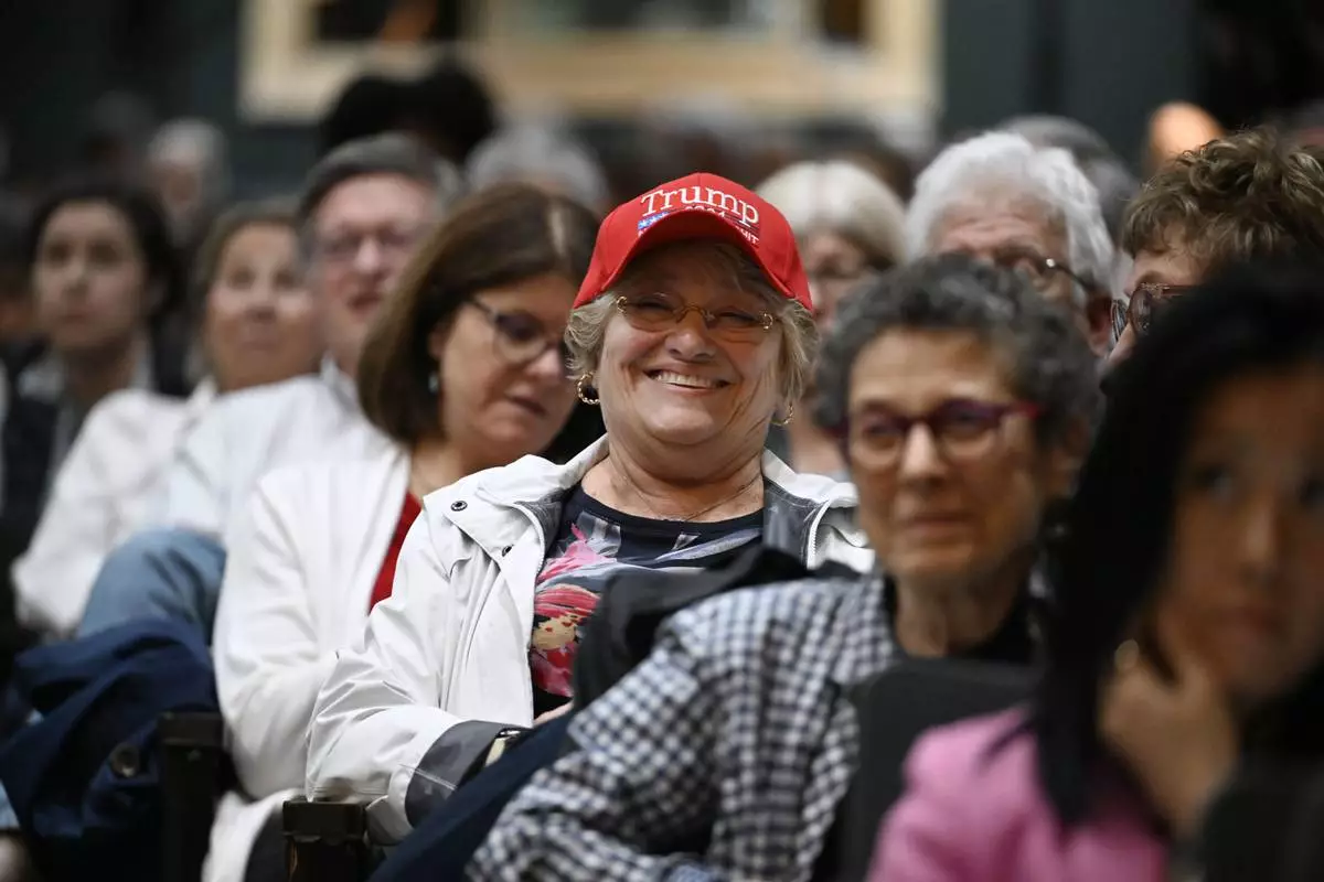 An audience member smiles while listening to a town hall held by U.S. Rep. Mike Lawler, R-N.Y., Sunday, May 4, 2025, in Somers, N.Y. (AP Photo/Jessica Hill)