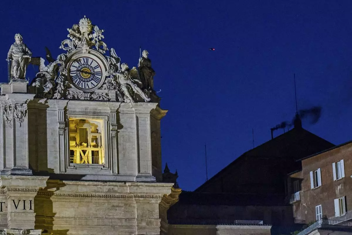 Black smoke billows from the chimney of the Sistine Chapel, where 133 cardinals are gathering on the first day of the conclave, indicating that a successor of late Pope Francis was not elected, Wednesday, May 7, 2025. (AP Photo/Bernat Armangue)