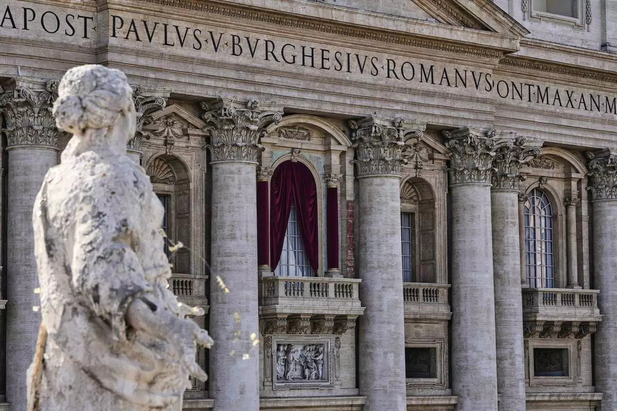 View of the main balcony of the St Peter's Basilica prior to the beginning of the conclave, at the Vatican, Wednesday, May 7, 2025. (AP Photo/Markus Schreiber)