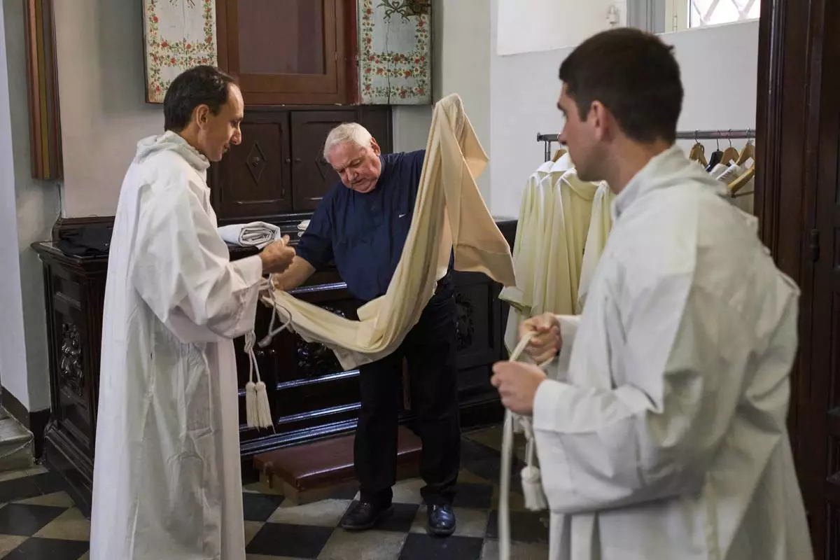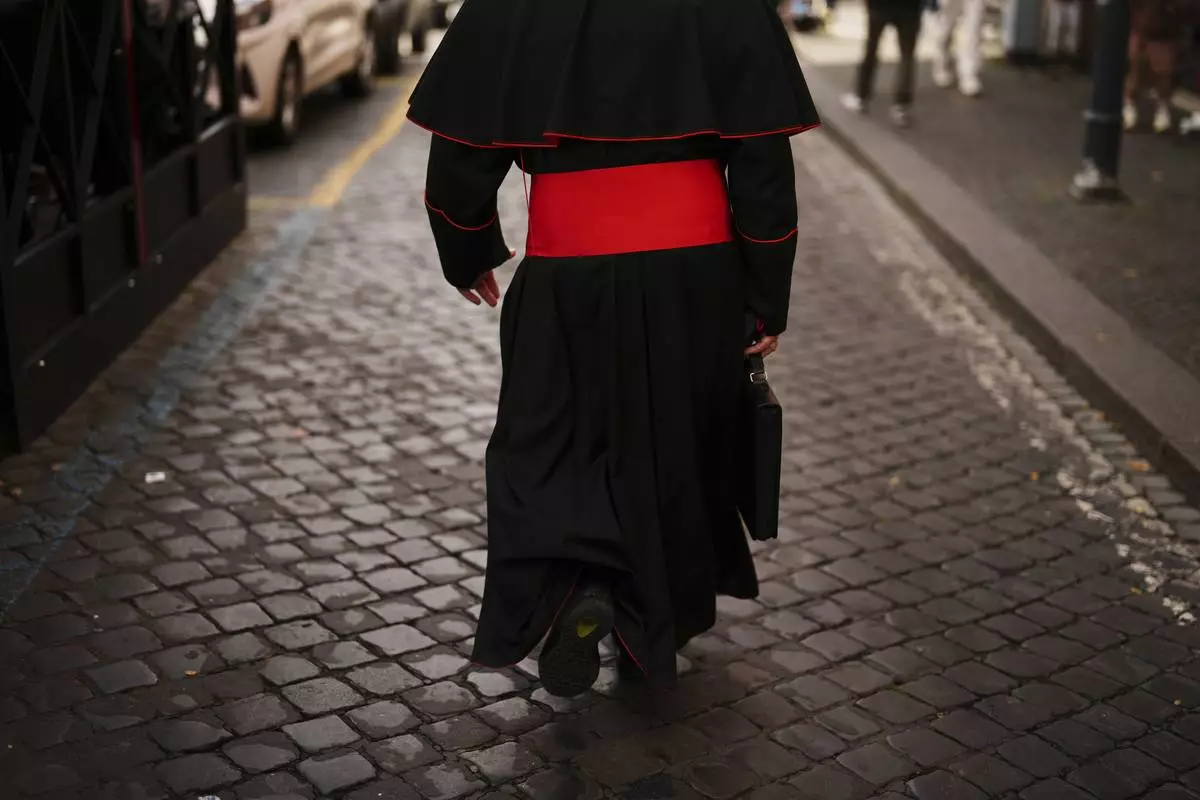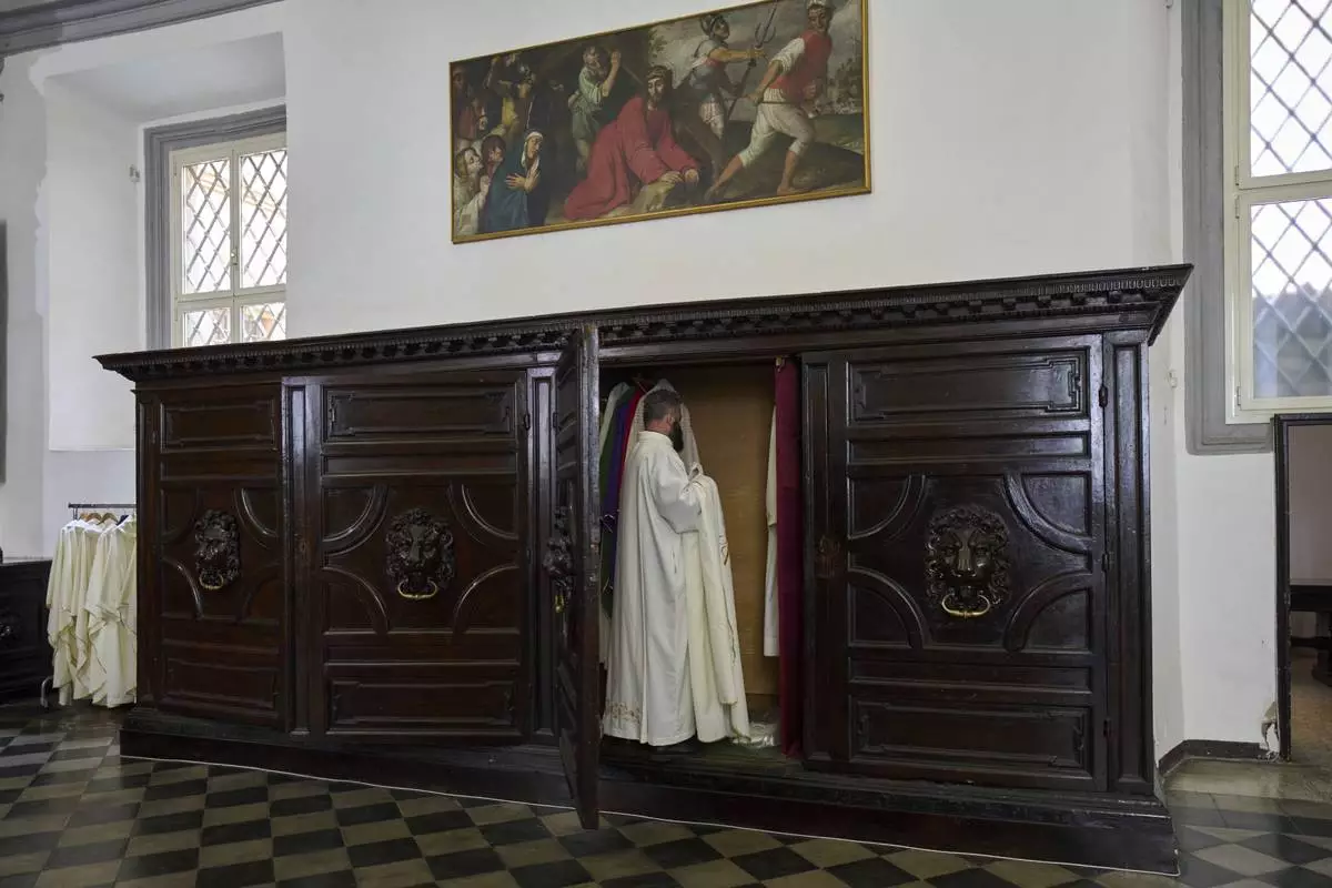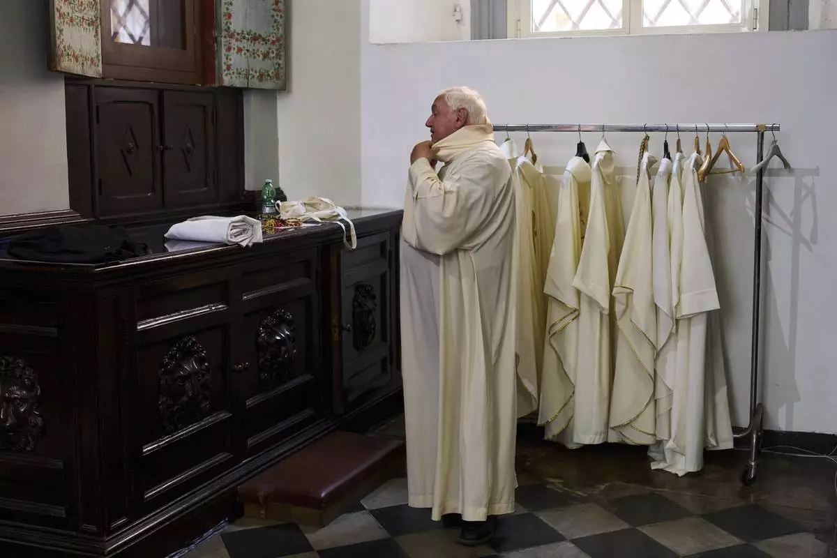 A priest removes his chasuble in the sacristy of Santa Maria ai Monti Church after Mass in Rome, Sunday, May 4, 2025. (AP Photo/Bernat Armangue)