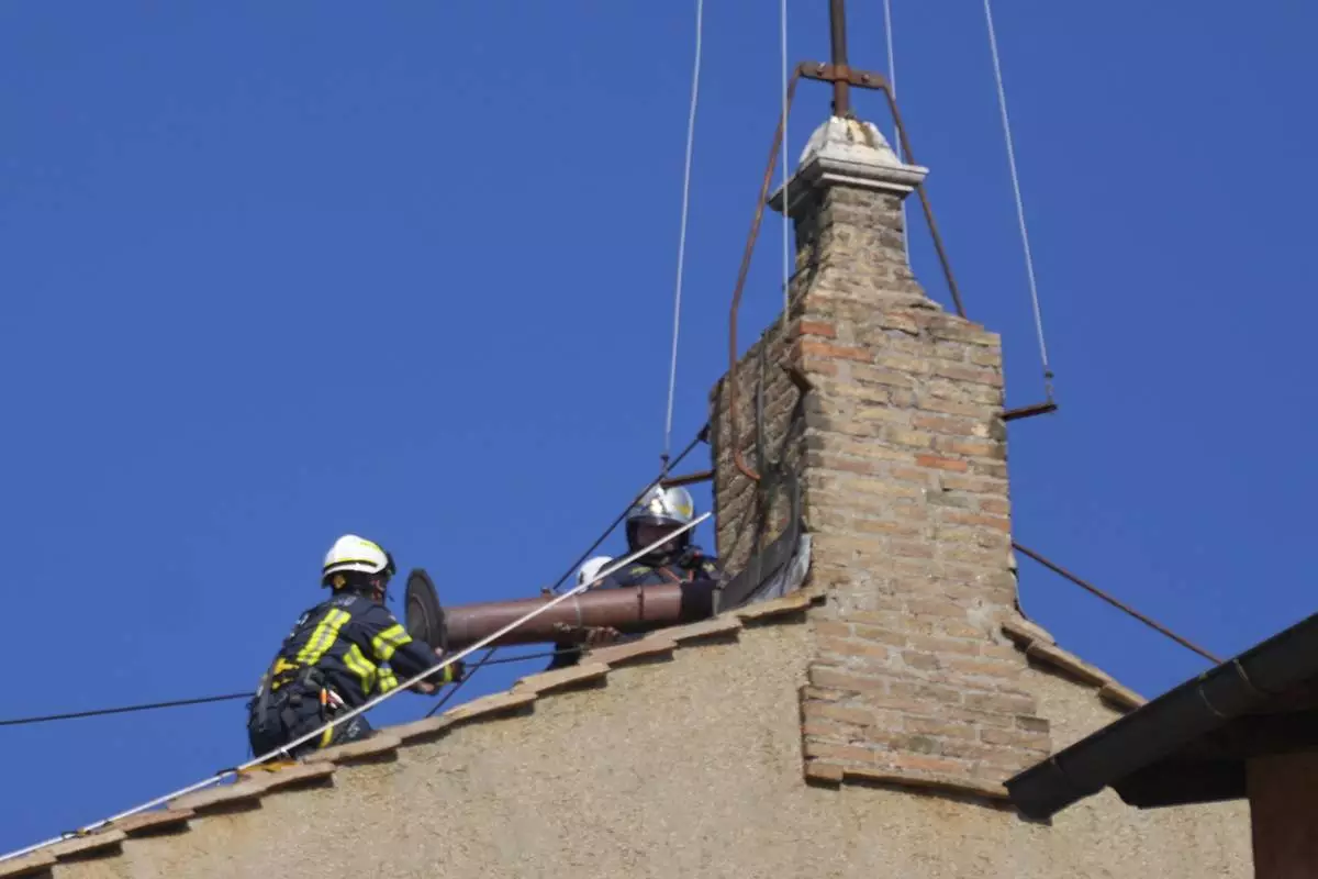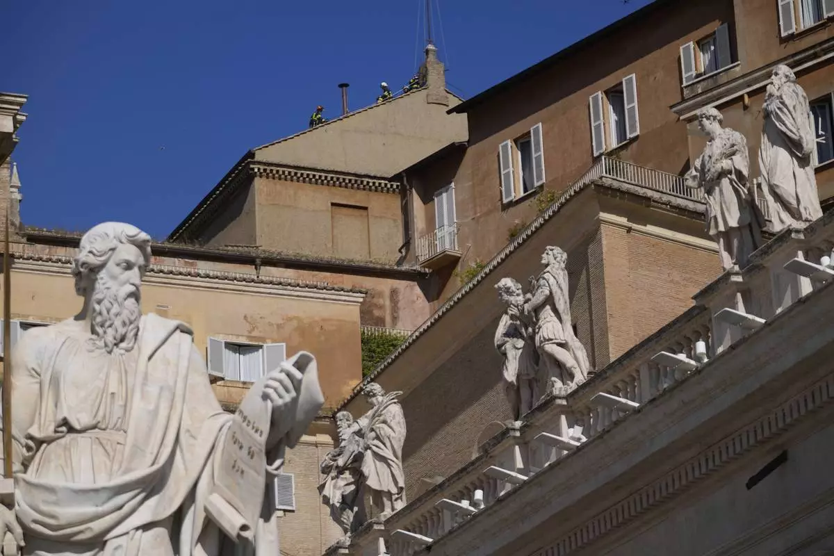 Firefighters place the chimney on the roof of the Sistine Chapel, where cardinals will gather to elect the new pope, at the Vatican, Friday, May 2, 2025. (AP Photo/Gregorio Borgia)