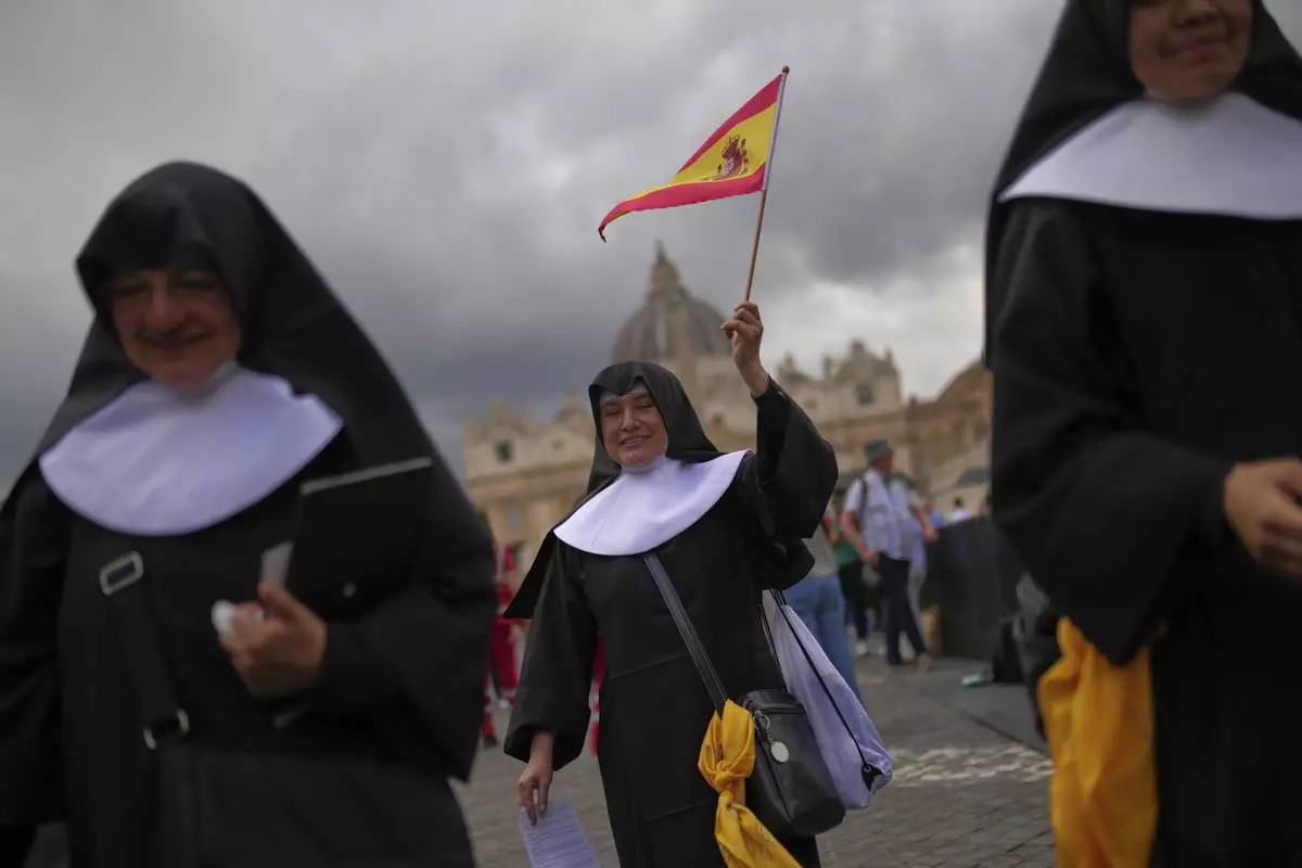 A nun waves a Spanish flag near St. Peter's Basilica, background, in Rome, on Wednesday, May 7, 2025, on the day cardinals sequester themselves at the Vatican for the start of a conclave to elect the 267th Roman pontiff, a successor to Pope Francis. (AP Photo/Francisco Seco)