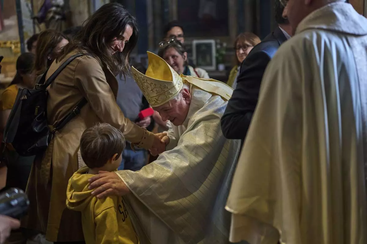 Cardinal Jean-Marc Aveline, center, greets faithful after a mass at Santa Maria ai Monti church in Rome, Sunday, May 4, 2025. (AP Photo/Bernat Armangue)