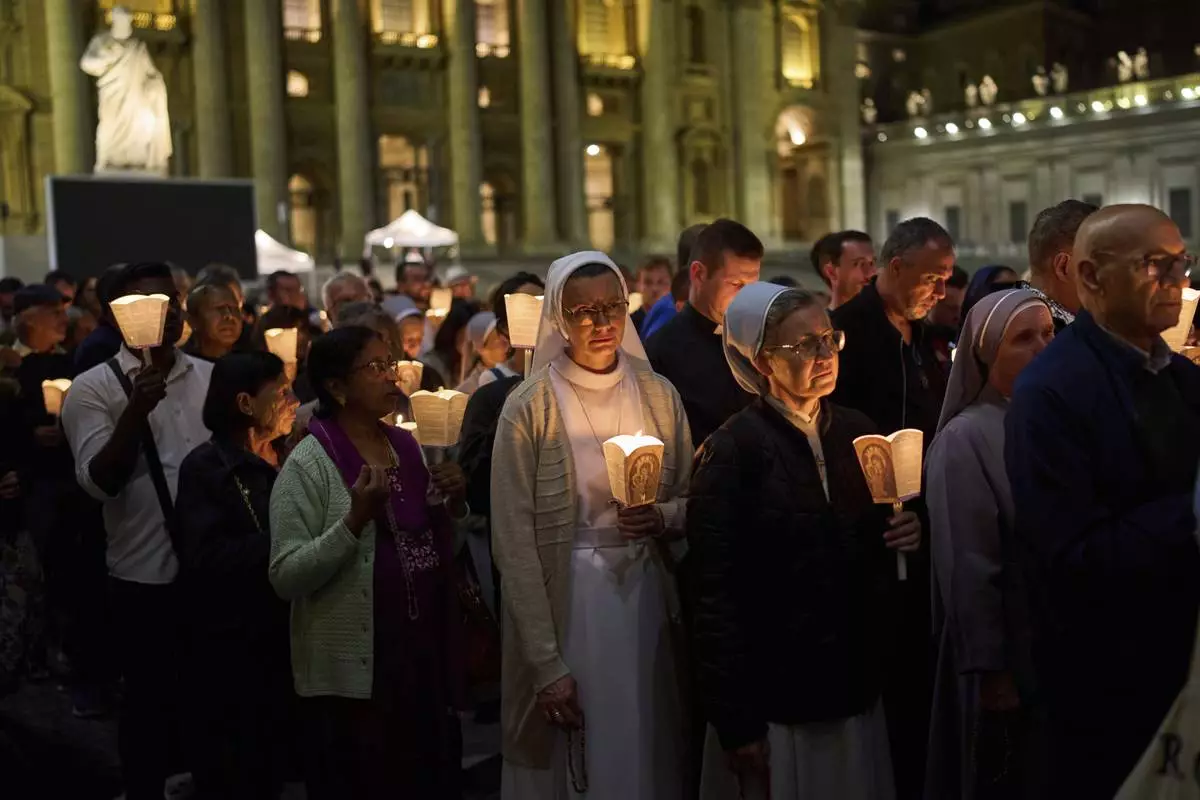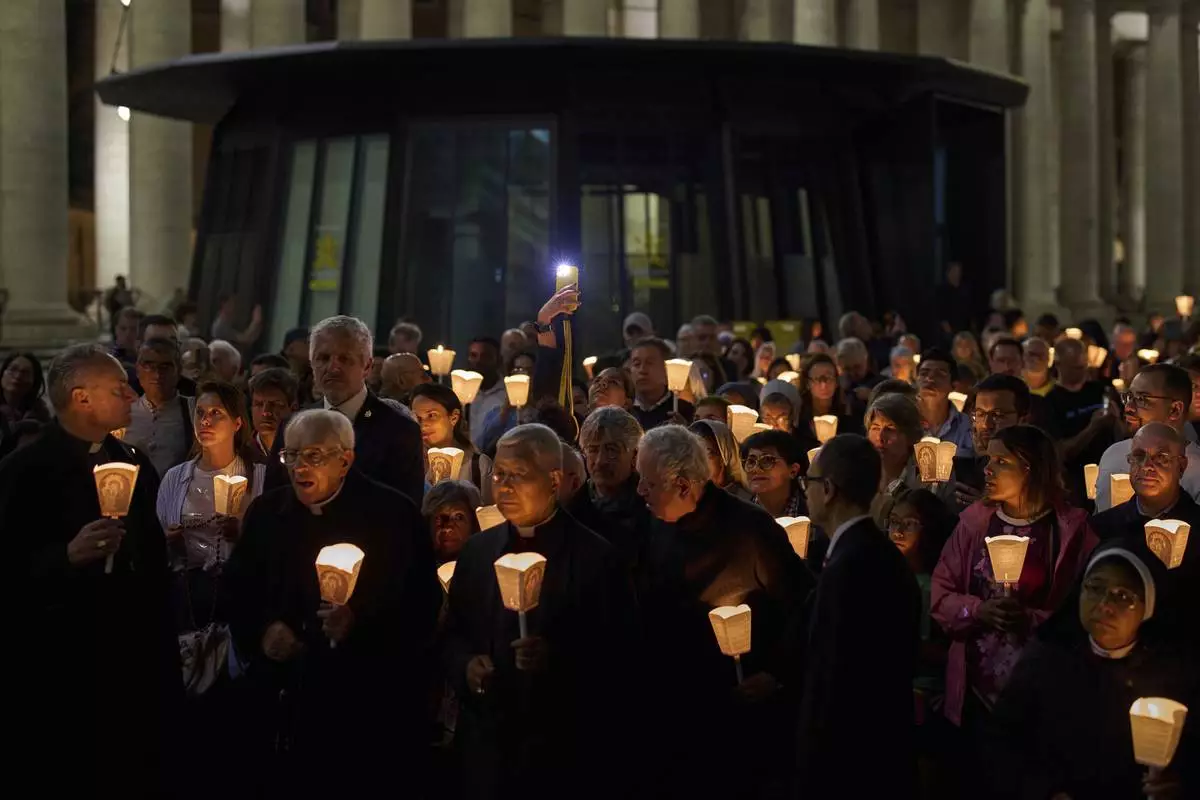 Faithful gather for a rosary prayer and a candlelight procession with the image of Mater Ecclesiae in St. Peter's Square at the Vatican,Saturday, May 3, 2025. (AP Photo/Bernat Armangue)