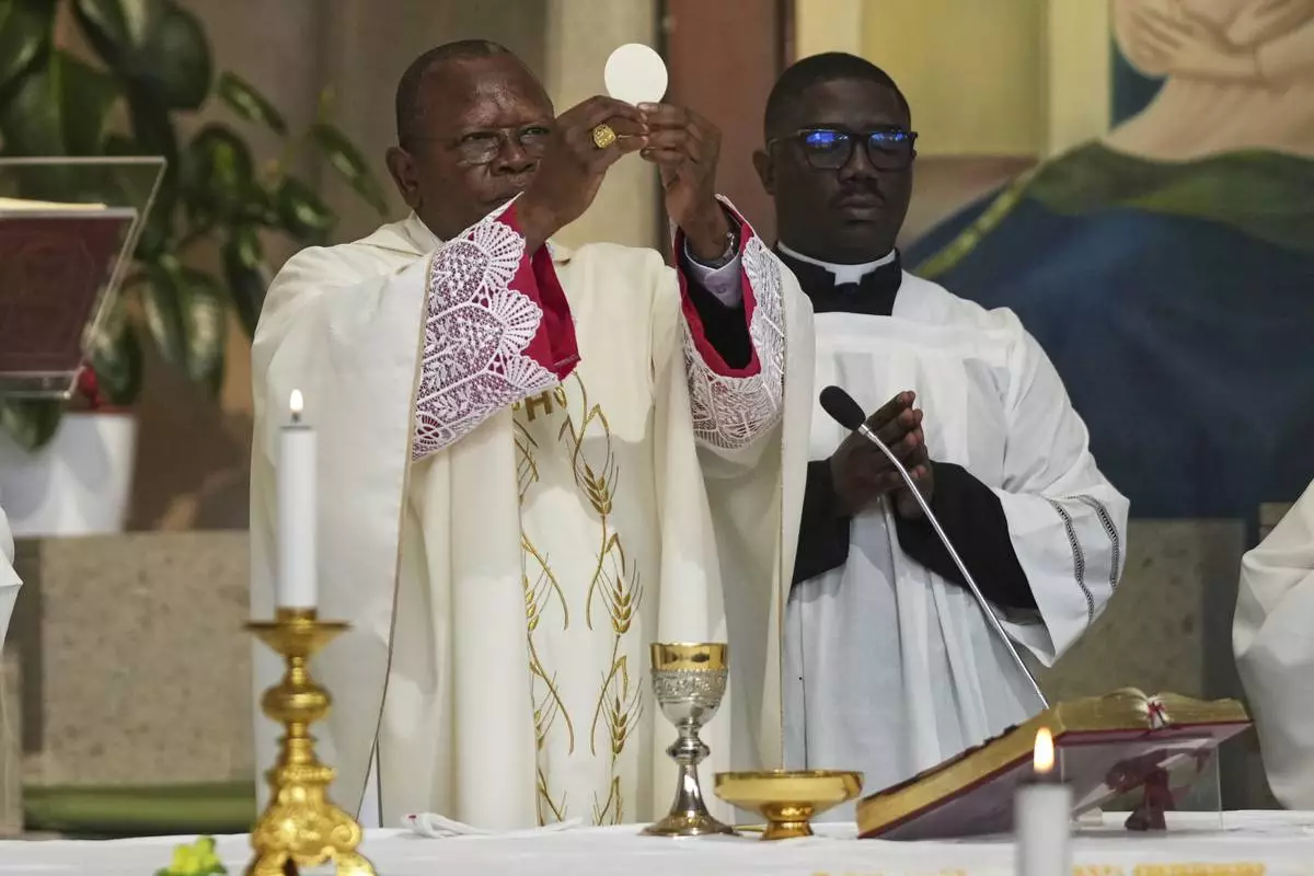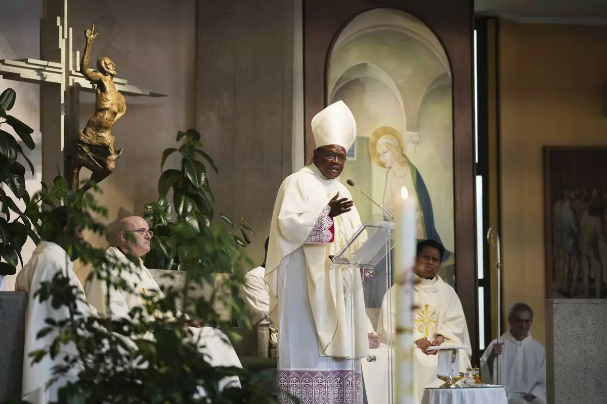 Cardinal Fridolin Ambongo Besungu celebrates Mass at his titular church, San Gabriele Arcangelo all'Acqua Traversa three days before the conclave to elect the 267th pope of the Roman Catholic Church, in Rome, Sunday, May 4, 2025. (AP Photo/Andrew Medichini)