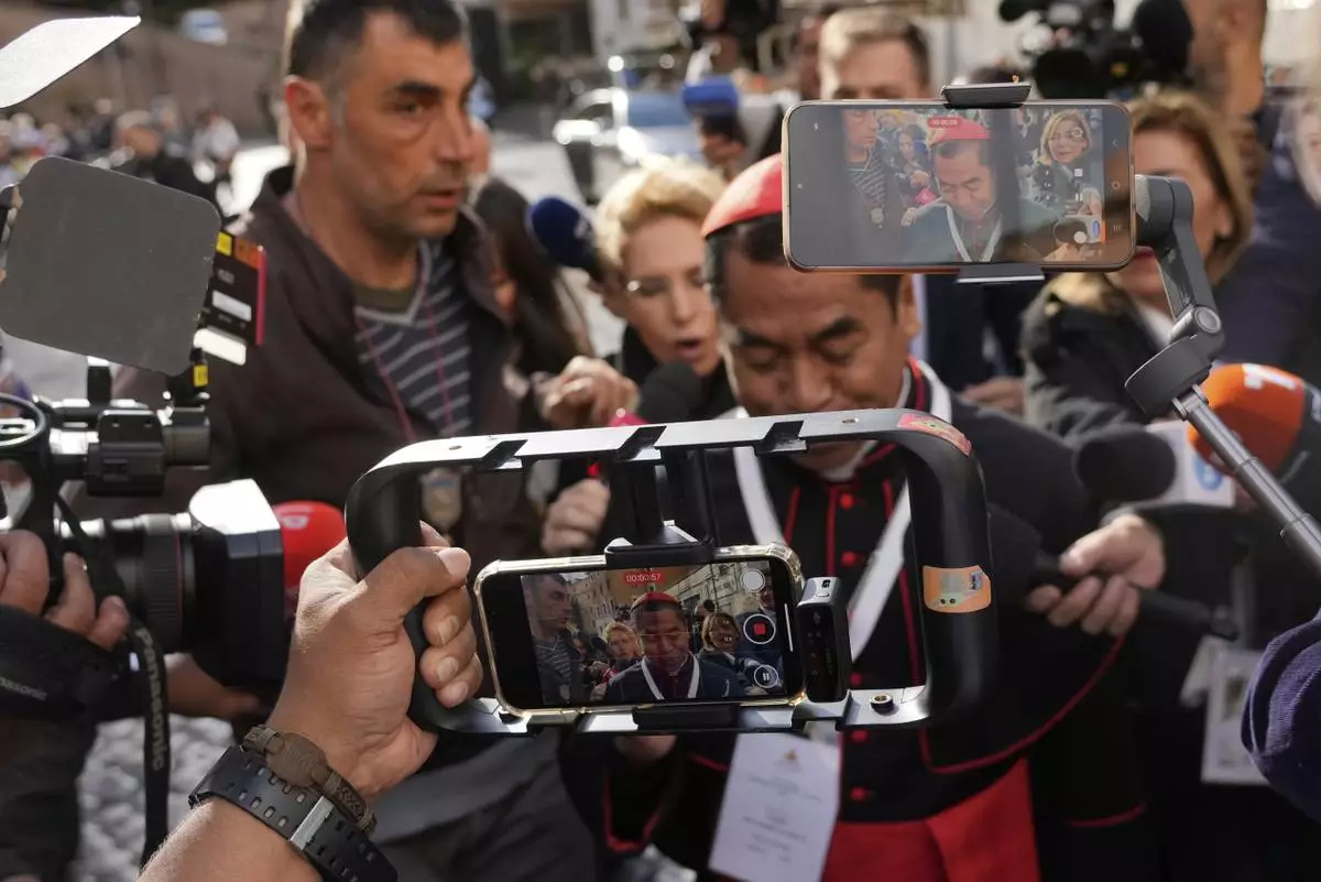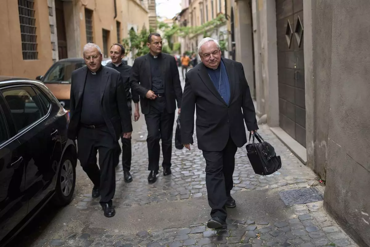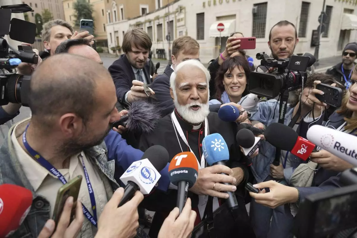 Cardinal Ladislav Nemet talks to journalists, on Monday, May 5, 2025, after attending the General Congregation of cardinals in the New Synod Hall where they are preparing for the upcoming conclave starting on May 7, to elect the 267th Roman pontiff. (AP Photo/Francisco Seco)