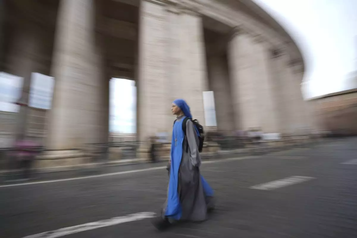 A nun walks past Bernini's colonnade near St. Peter's Square at the Vatican, Monday, May 5, 2025. (AP Photo/Andrew Medichini)