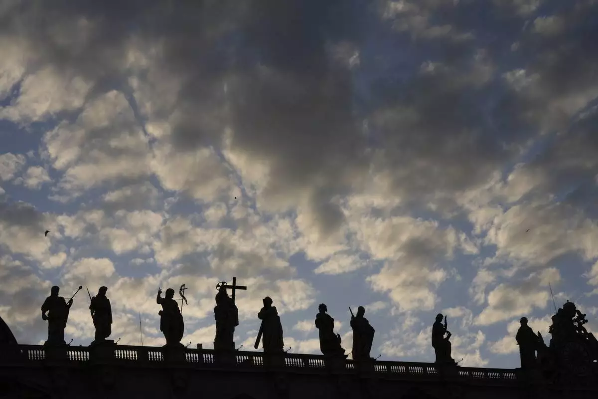 Statues of the Bernini Colonnade are silhouetted against a cloudy sky during the cardinals' conclave to elect a new pope, at the Vatican, Wednesday, May 7, 2025. (AP Photo/Luca Bruno)