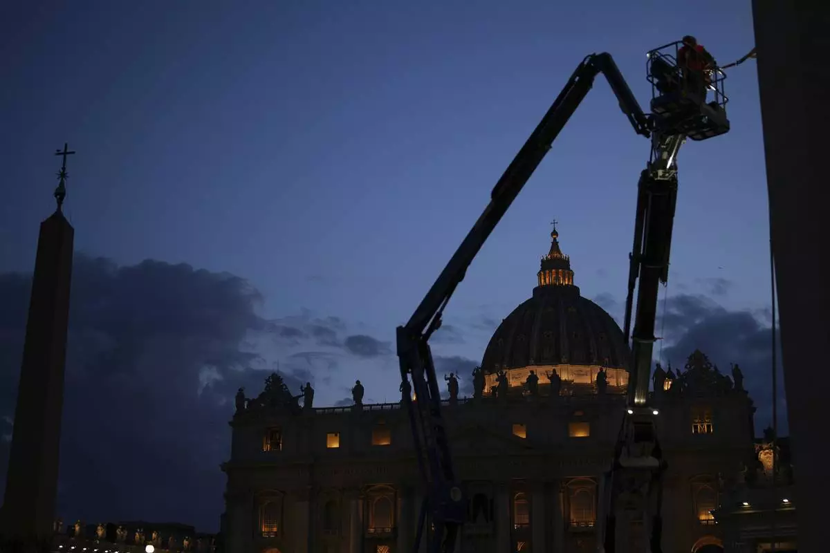 Workers install sound system speakers in St. Peter's Square, at the Vatican, on Monday, May 5, 2025, ahead of the upcoming conclave starting on May 7, to elect the 267th Roman pontiff. (AP Photo/Francisco Seco)