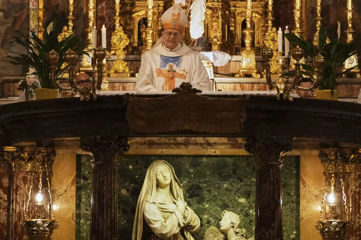 Cardinal Peter Erdo leads a mass at his titular church of Santa Francesca Romana in Rome, Sunday, May 4, 2025. (AP Photo/Francisco Seco)