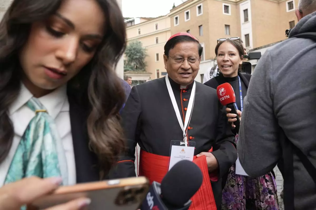 Guatemalan Cardinal Alvaro Ramazzini speaks during an interview with Associated Press at the headquarters of the Scalabrinian congregation, in Rome, Saturday, May 3, 2025. (AP Photo/Francisco Seco)