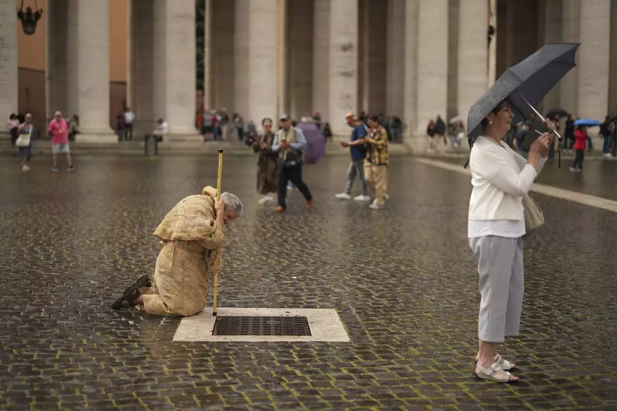 A faithful prays in St. Peter's Square during a final Mass by cardinals ahead of the conclave, at the Vatican, Wednesday, May 7, 2025. (AP Photo/Francisco Seco)