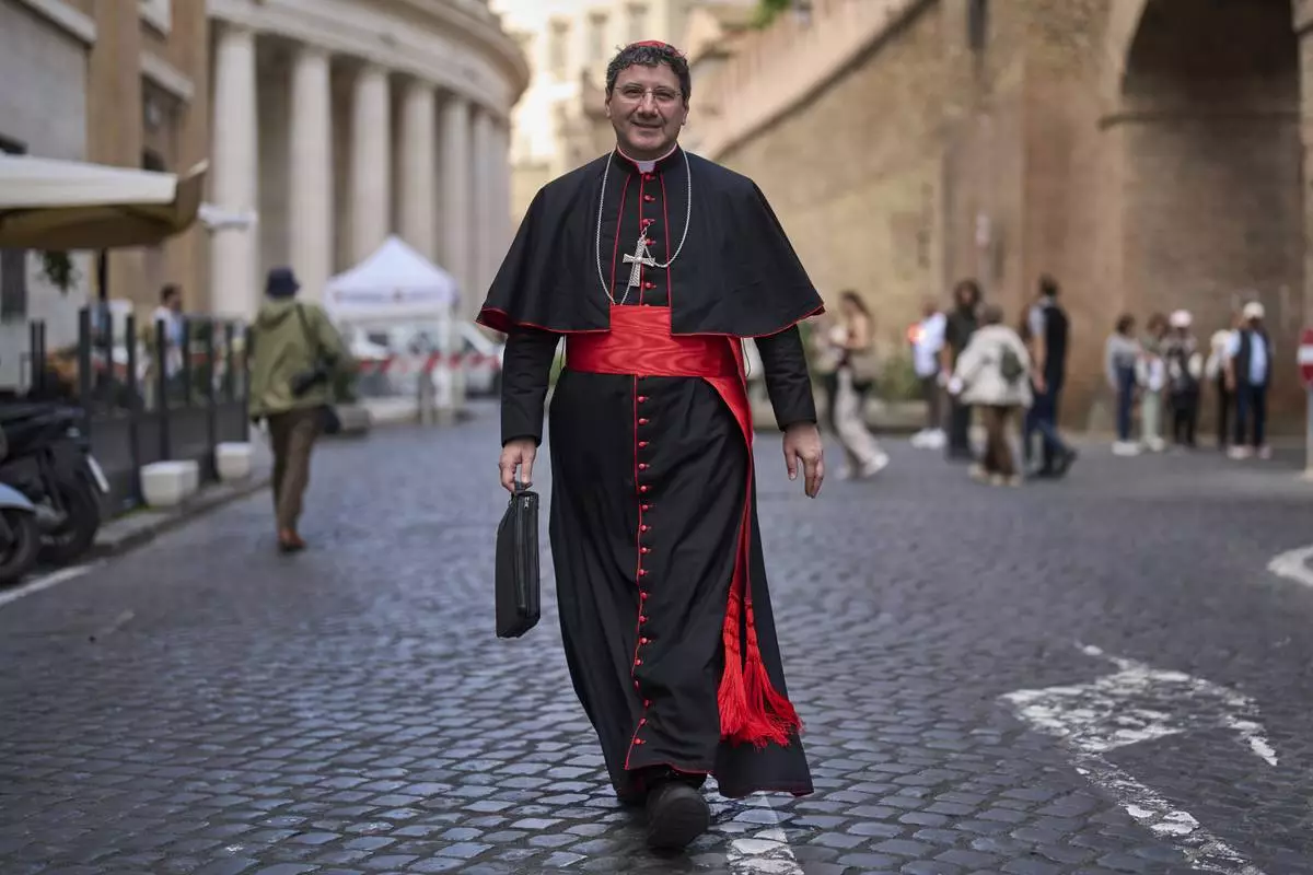 Cardinal Jean-Marc Aveline, foreground, walks in downtown Rome, Sunday, May 4, 2025. (AP Photo/Bernat Armangue)