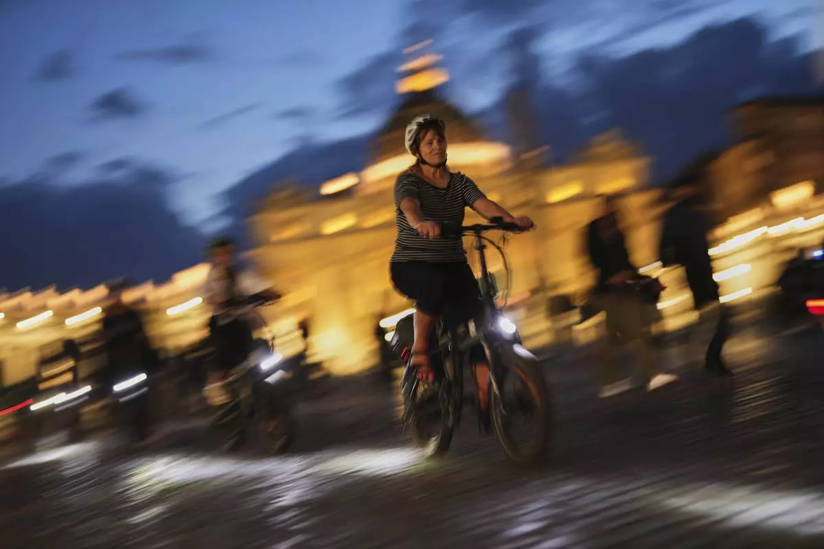 Tourists ride their bicycles next to St. Peter's Basilica, background, at the Vatican, on Monday, May 5, 2025, two days ahead of the upcoming conclave starting on May 7, to elect the 267th Roman pontiff. (AP Photo/Francisco Seco)