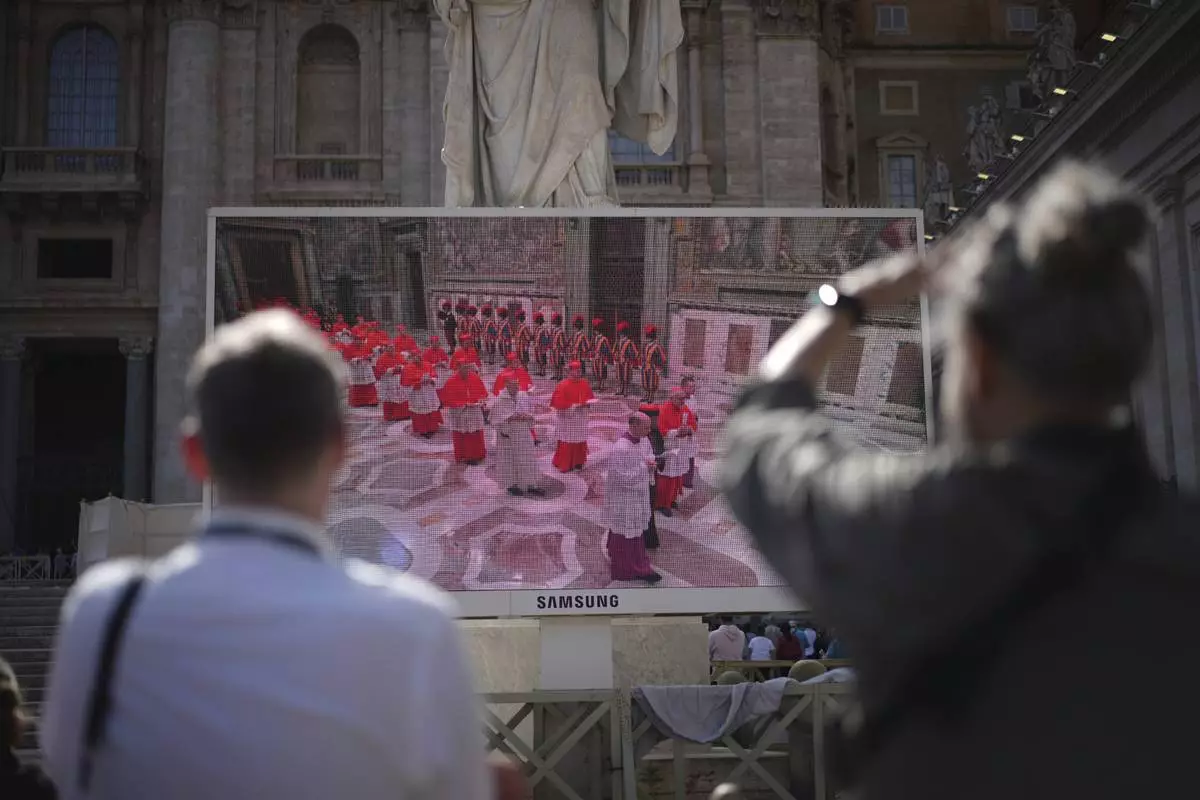 Faithful watch a giant screen showing images of cardinals entering the conclave, in St. Peter's Square at the Vatican, Wednesday, May 7, 2025. (AP Photo/Andrew Medichini)