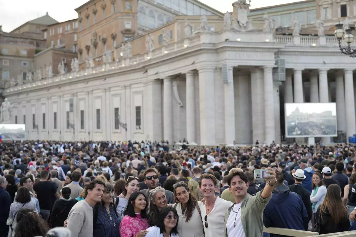 People gather in St Peter's Square as they wait to see the smoke billow from the chimney of the Sistine Chapel in St Peter's Square during the cardinals' conclave to elect a new pope, at the Vatican, Wednesday, May 7, 2025. (AP Photo/Francisco Seco)