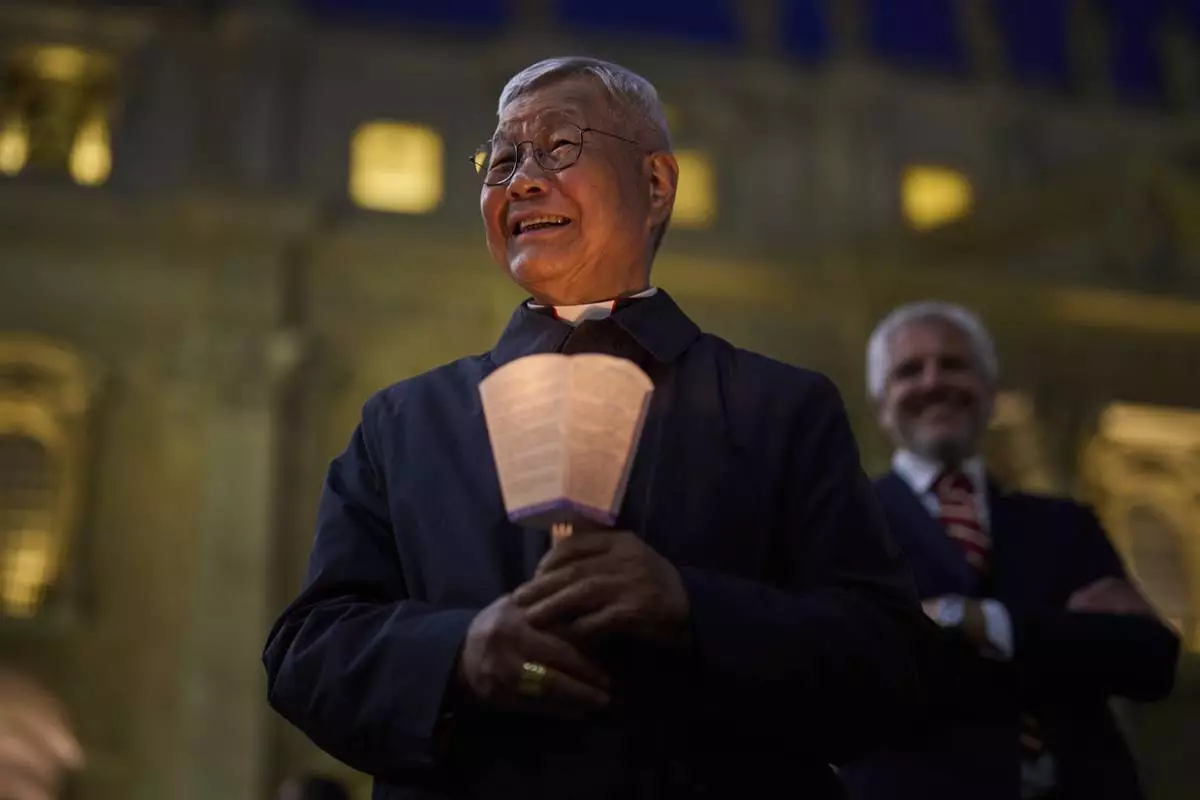 Cardinal Lazarus You Heung-sik before attending a rosary prayer and a candlelight procession with the image of Mater Ecclesiae in St. Peter's Square at the Vatican, Saturday, May 3, 2025. (AP Photo/Bernat Armangue)