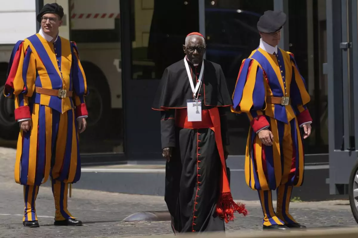 Cardinal Robert Sarah arrives at the Vatican, Friday, May 2, 2025, to attend the General Congregation of cardinals in the New Synod Hall where they are preparing for the upcoming conclave starting on May 7, to elect the 267th Roman pontiff. (AP Photo/Gregorio Borgia)