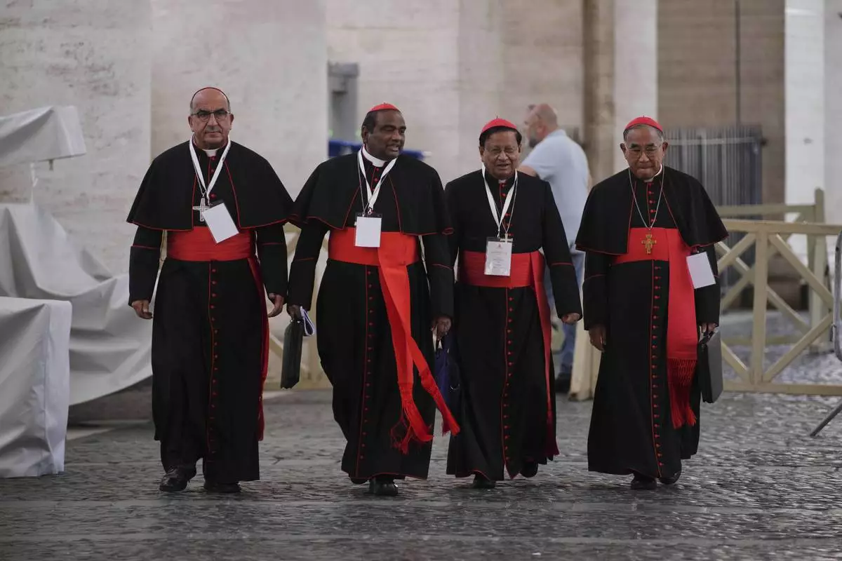 From left, cardinals Fernando Natalio Chomalí Garib, Anthony Poola, Charles Maung Bo and Francis Xavier Kriengsak Kovithavanij leave the Vatican, Saturday, May 3, 2025, after attending a session of the General Congregation of cardinals in the New Synod Hall where they are preparing for the upcoming conclave starting on May 7, to elect the 267th Roman pontiff. (AP Photo/Andrew Medichini)