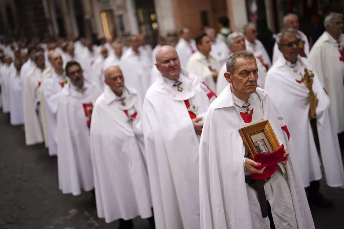 Catholic Templari Oggi or "Templars Today" association members parade along the city centre to arrive to St. Mary and the Martyrs Basilica, or Agrippa Pantheon, in Rome, Sunday, May 4, 2025. (AP Photo/Francisco Seco)