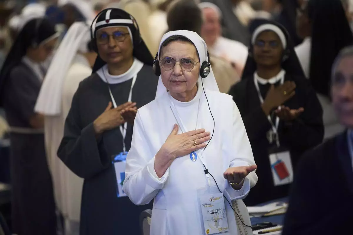 Nuns pray during a congress of nearly 900 superiors of the world's female religious orders in Rome, Monday, May 5, 2025. (AP Photo/Alessandra Tarantino)