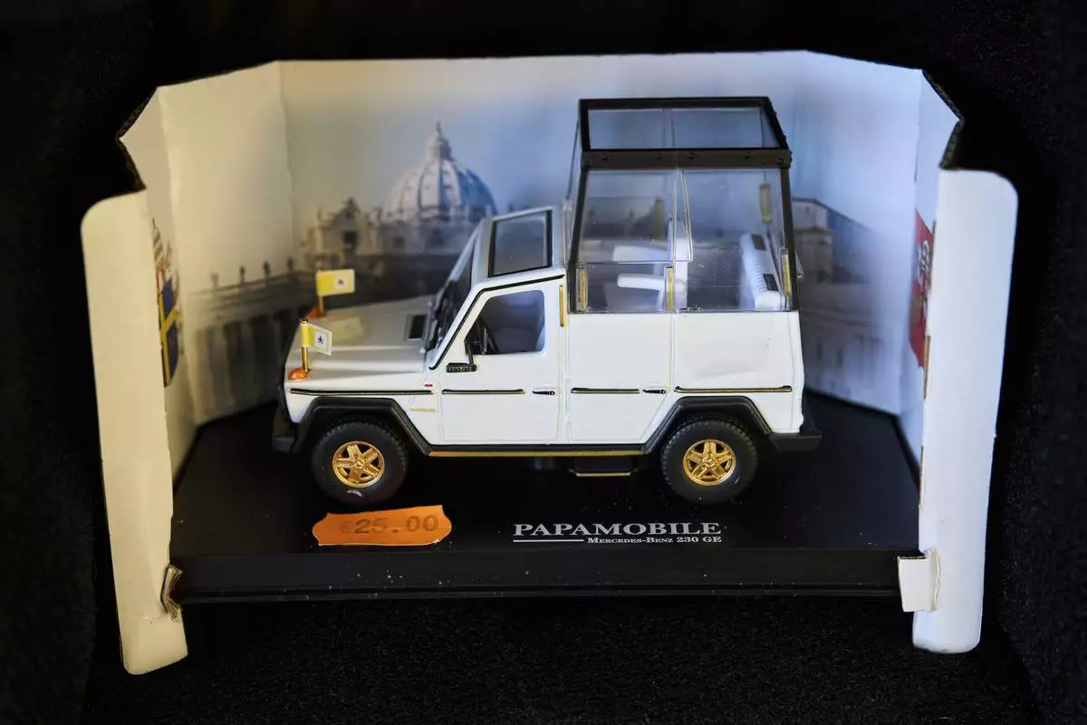 A scale car of the popemobile in Rome, Thursday, May 1, 2025. (AP Photo/Bernat Armangue)