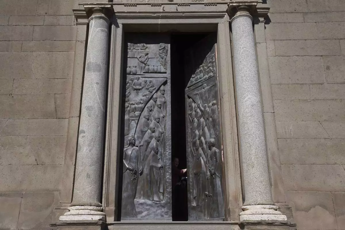 An image of the cardinals who voted in the longest conclave in the Catholic Church's history, is carved on the bronze door of St. Lorenzo Cathedral, in Viterbo, Italy, Friday, May 2, 2025. (AP Photo/Alessandra Tarantino )