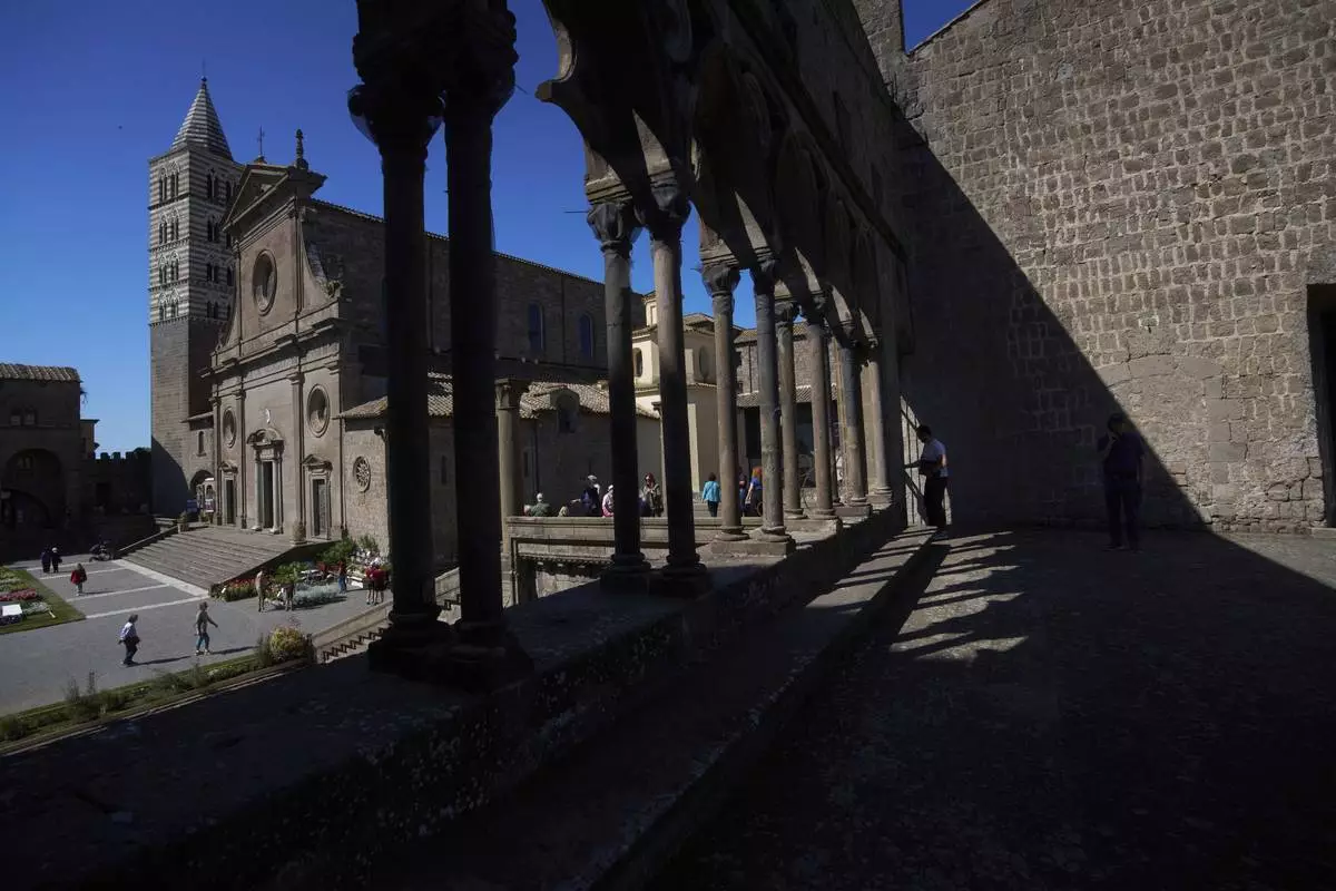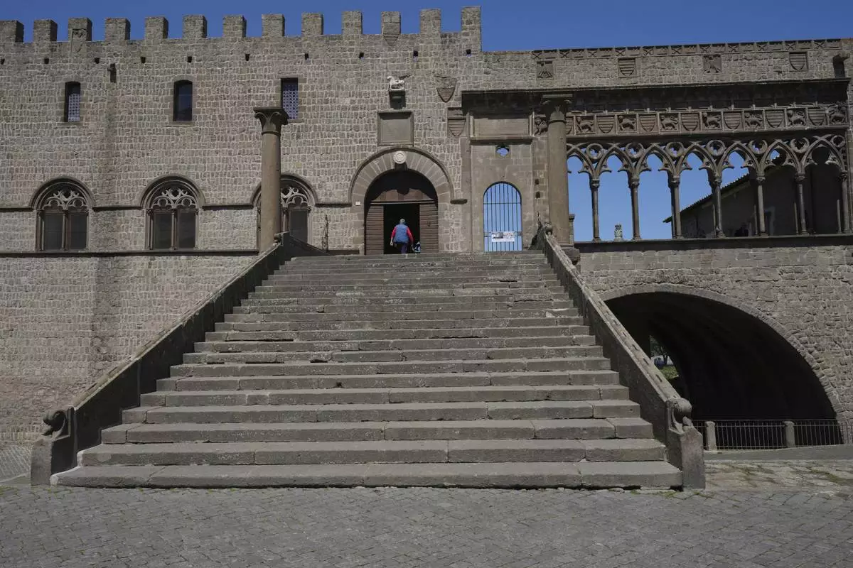 A tourist enters the Palace of the Popes that hosted the longest conclave in the Catholic Church's history, in Viterbo, Italy, Tuesday, April 29, 2025. (AP Photo/Alessandra Tarantino )