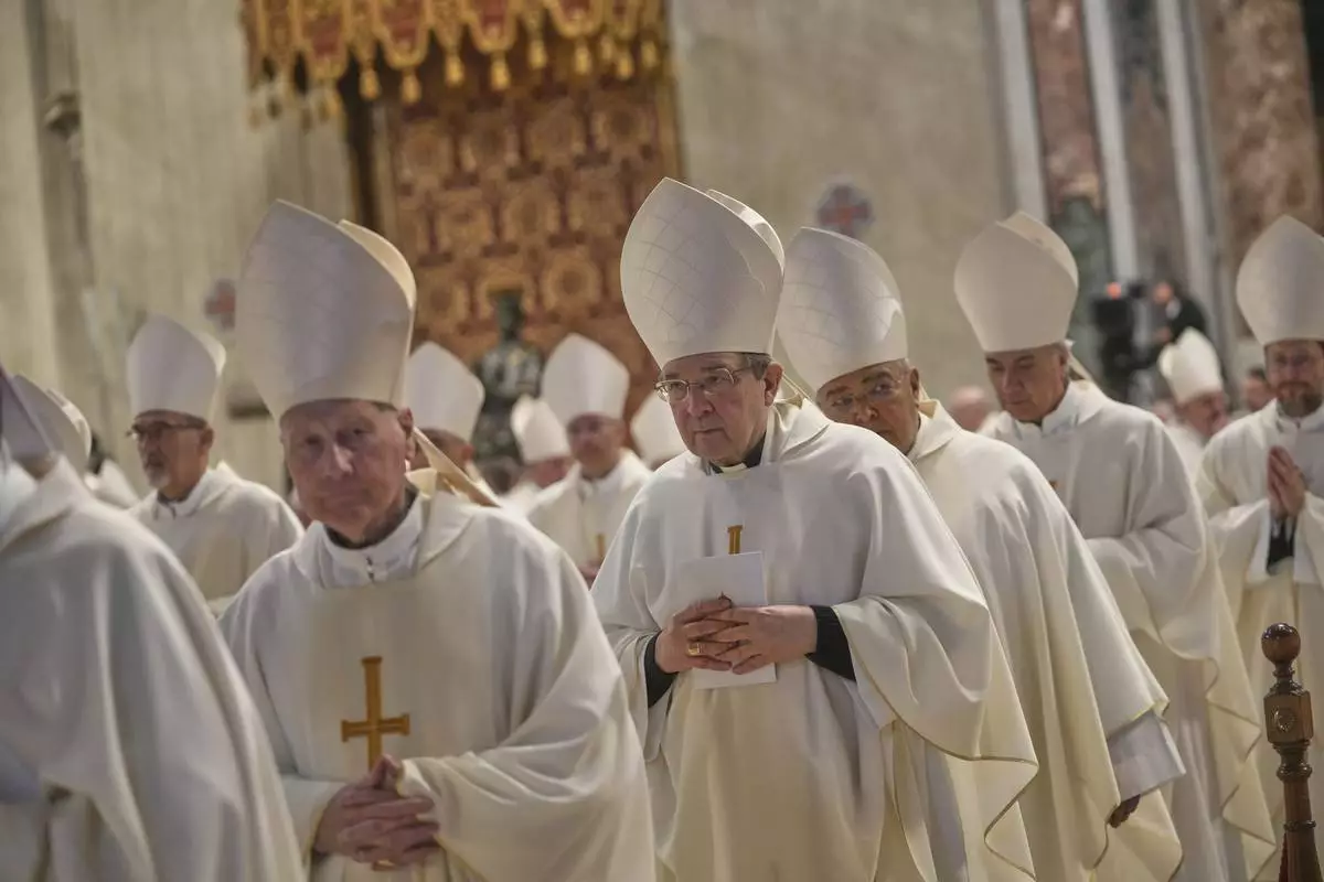 Cardinals, with white mitre hats, attend a final Mass inside St. Peter's Basilica, before the conclave to elect a new pope, at the Vatican, Wednesday, May 7, 2025. (AP Photo/Gregorio Borgia)