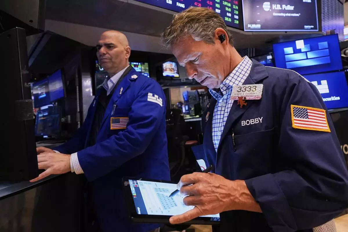 Specialist Philip Finale, left, and trader Robert Charmak work on the floor of the New York Stock Exchange, Friday, May 2, 2025. (AP Photo/Richard Drew)