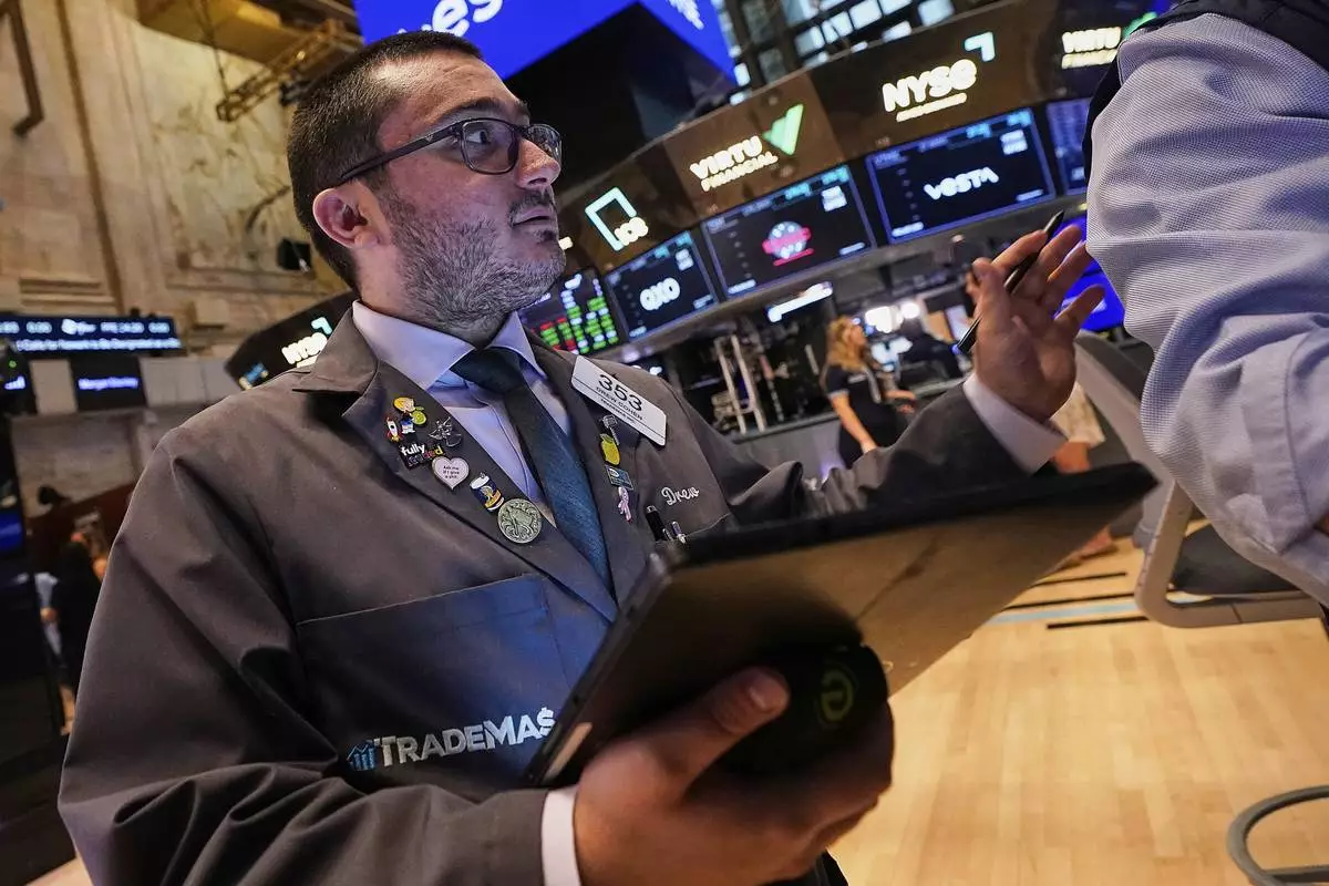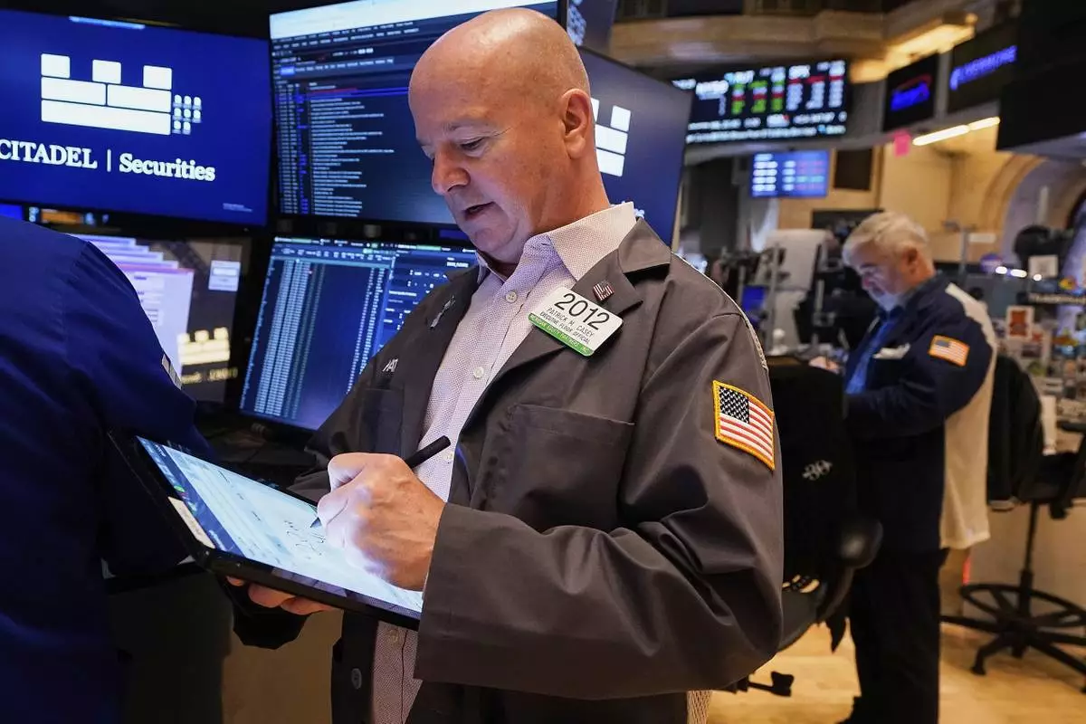 Trader Michael Capolino works on the floor of the New York Stock Exchange, Monday, May 5, 2025. (AP Photo/Richard Drew)