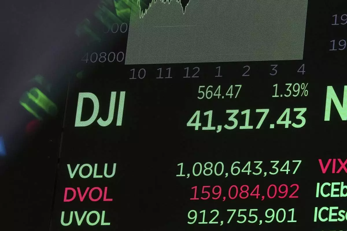 A board above the trading floor of the New York Stock Exchange displays the closing number for the Dow Jones industrial average, Friday, May 2, 2025. (AP Photo/Richard Drew)