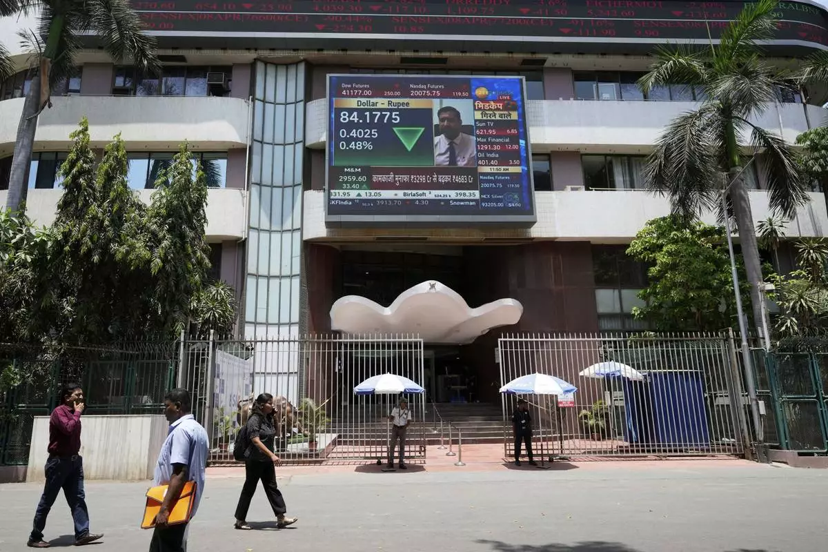 People walk past a live screen on the facade of Bombay Stock Exchange (BSE) building in Mumbai, India, Monday, May 5, 2025. (AP Photo/Rajanish Kakade)
