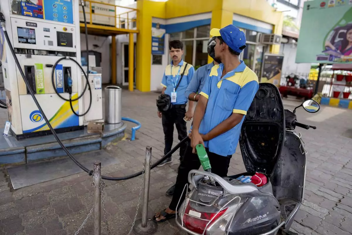 An Indian man fills petrol in a two wheeler at a fuel pump in Prayagraj, in the northern Indian state of Uttar Pradesh, Monday, May 5, 2025. (AP Photo/Rajesh Kumar Singh)