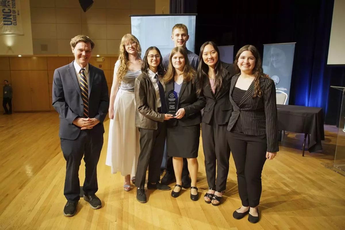 From left, students Luke Calhoun, Olivia Beazer, Sona Zarkou, Mae Bradford, front, Lincoln Bradford, back, Cindy Huang and Juliana Migliati from Arizona's BASIS Flagstaff Charter School pose with the first place trophy after winning the National High School Ethics Bowl in Chapel Hill, N.C., on Sunday, April 13, 2025. (AP Photo/Allen G. Breed)