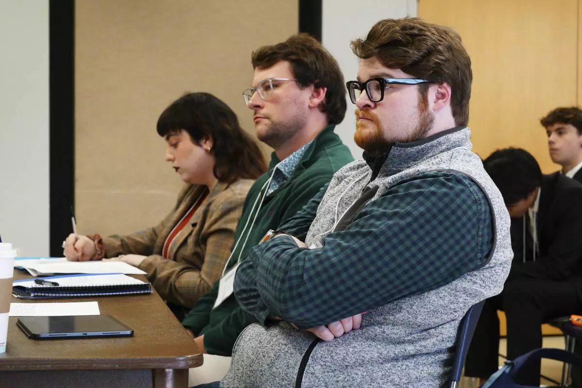 Three judges listen to questioning during a quarterfinal round of the National High School Ethics Bowl in Chapel Hill, N.C., on Sunday, April 13, 2025. (AP Photo/Allen G. Breed)