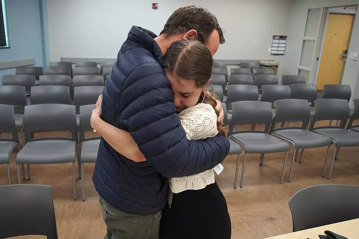 In this image taken from video, Kevin Lyman comforts his daughter, Lizzie, after her team from Atlanta's Midtown High School lost in the semifinals of the National High School Ethics Bowl, Sunday, April 23, 2025, in Chapel Hill, N.C. (AP Photo/Allen G. Breed)