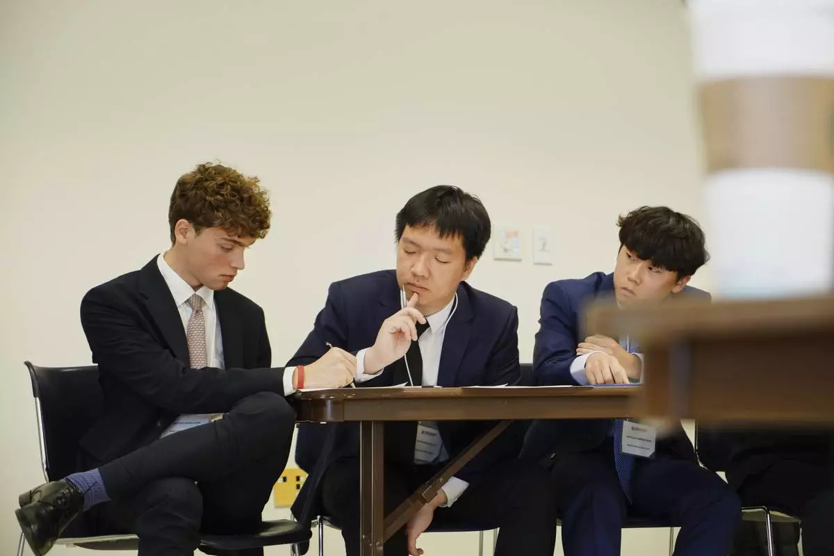 Teams have been discussing a group of cases for weeks, but they don't know which they'll be asked about. Once the question is read, they are given a few minutes to discuss. That’s when one or two of the teammates generally scurry around the table to huddle. Intense whispering and furious scribbling ensue.