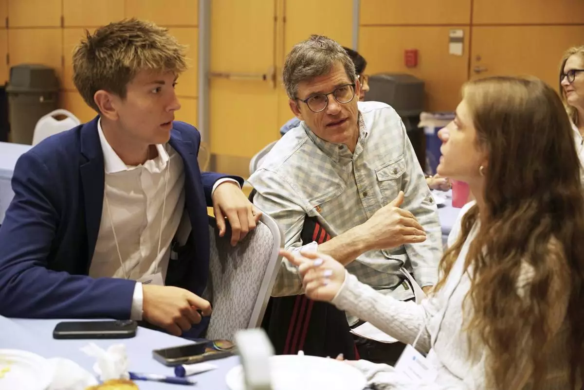 Midtown High School Ethics Bowl teammates Eric Snell, left, and Eve Nahmias speak with coach Eddy Nahmias, Eve's father, in between rounds of the National High School Ethics Bowl in Chapel Hill, N.C., on Sunday, April 13, 2025. (AP Photo/Allen G. Breed)