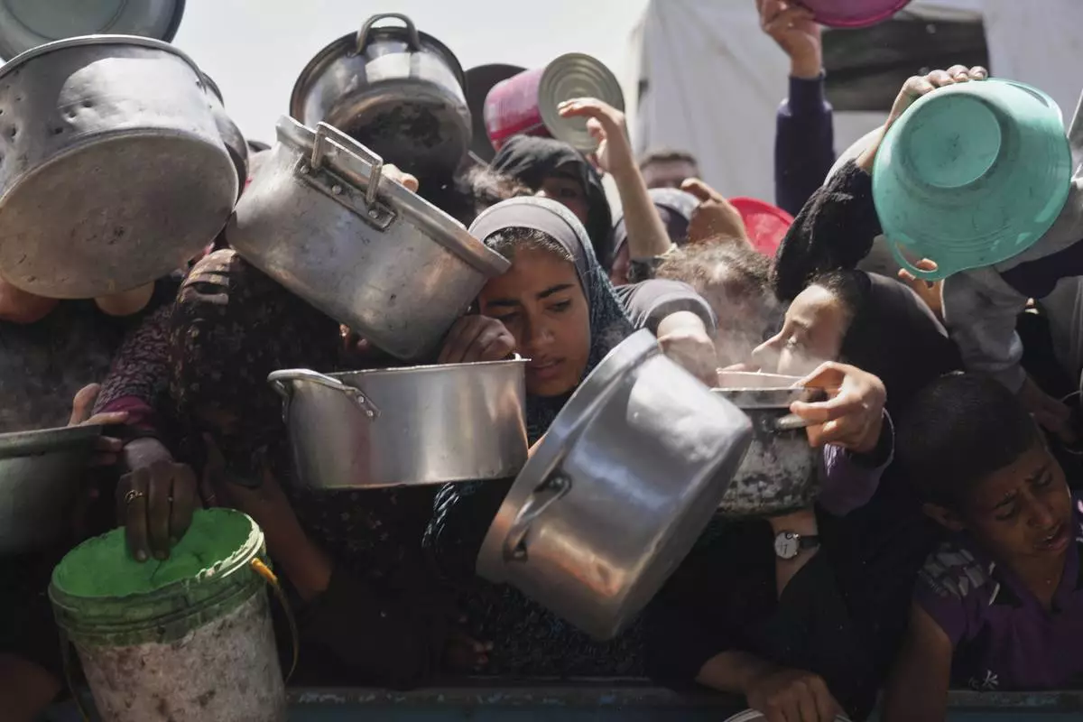 Palestinians struggle to get donated food at a community kitchen in Khan Younis, Gaza Strip, Monday, May 5, 2025. (AP Photo/Abdel Kareem Hana)