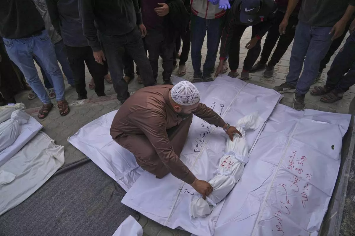 A morgue worker places the body of a child among the bodies of other victims killed in at least two separate Israeli army strikes, ahead of a burial ceremony outside Al-Shifa hospital in Gaza City, Monday, May 5, 2025. (AP Photo/Jehad Alshrafi)