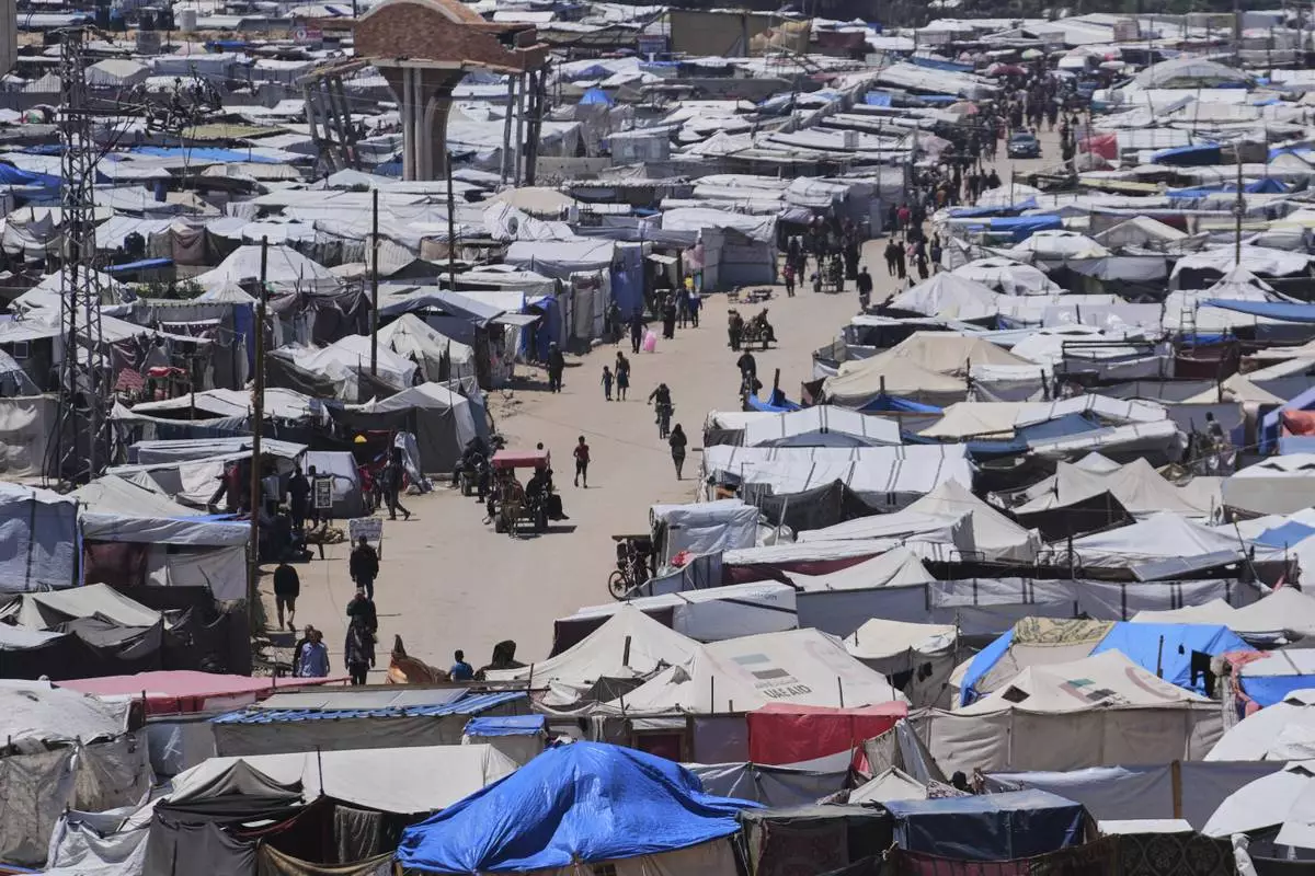 Displaced Palestinians walk through a makeshift tent camp in the Muwasi area of Khan Younis, in the Gaza Strip, on Monday, May 5, 2025. (AP Photo/Abdel Kareem Hana)